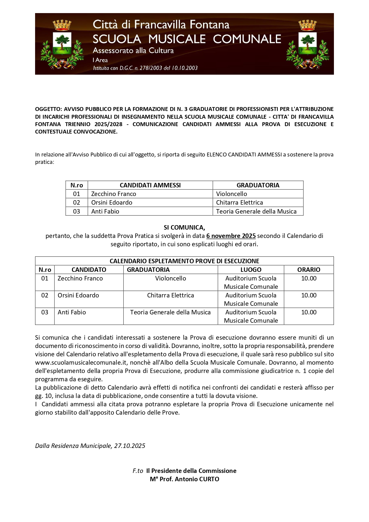 AVVISO PUBBLICO PER LA FORMAZIONE DI N. 3 GRADUATORIE DI PROFESSIONISTI PER L'ATTRIBUZIONE DI INCARICHI PROFESSIONALI DI INSEGNAMENTO NELLA SCUOLA MUSICALE COMUNALE - CITTA' DI FRANCAVILLA FONTANA TRIENNIO 2025/2028 - COMUNICAZIONE CANDIDATI AMMESSI ALLA PROVA DI ESECUZIONE E CONTESTUALE CONVOCAZIONE.